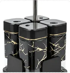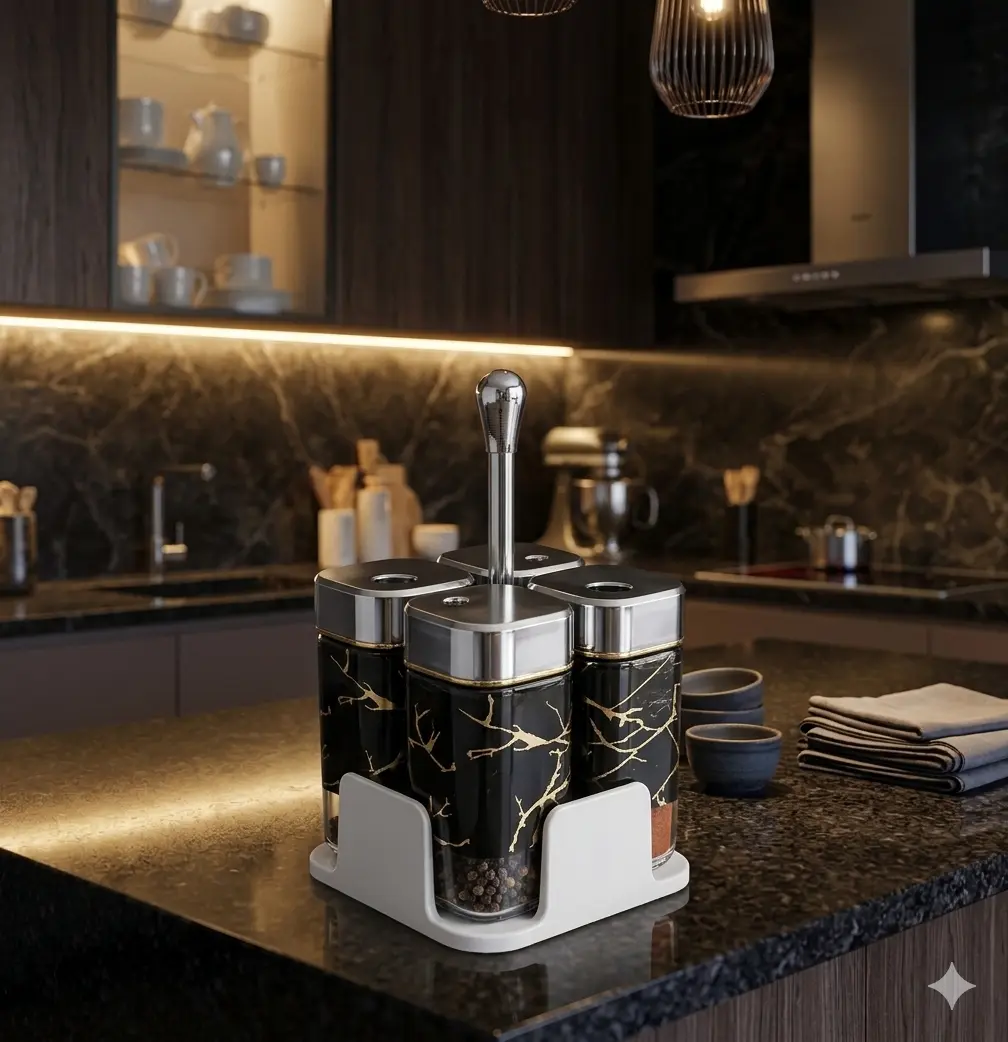 ¡Organiza tu cocina con elegancia! Este moderno set de especieros cuádruple combina funcionalidad y estilo: